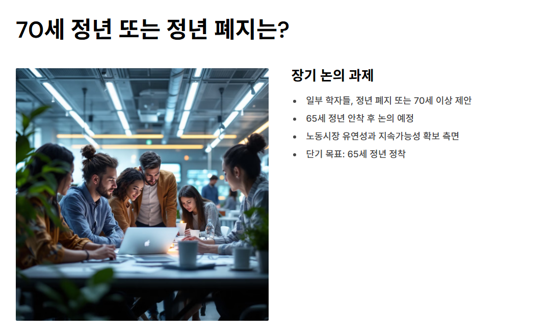 다만, 단순히 연장만 하는 게 아니라 임금피크제 개선, 직무 중심의 임금체계 개편, 청년 고용과의 균형 등 다양한 요소들이 논의되고 있습니다.