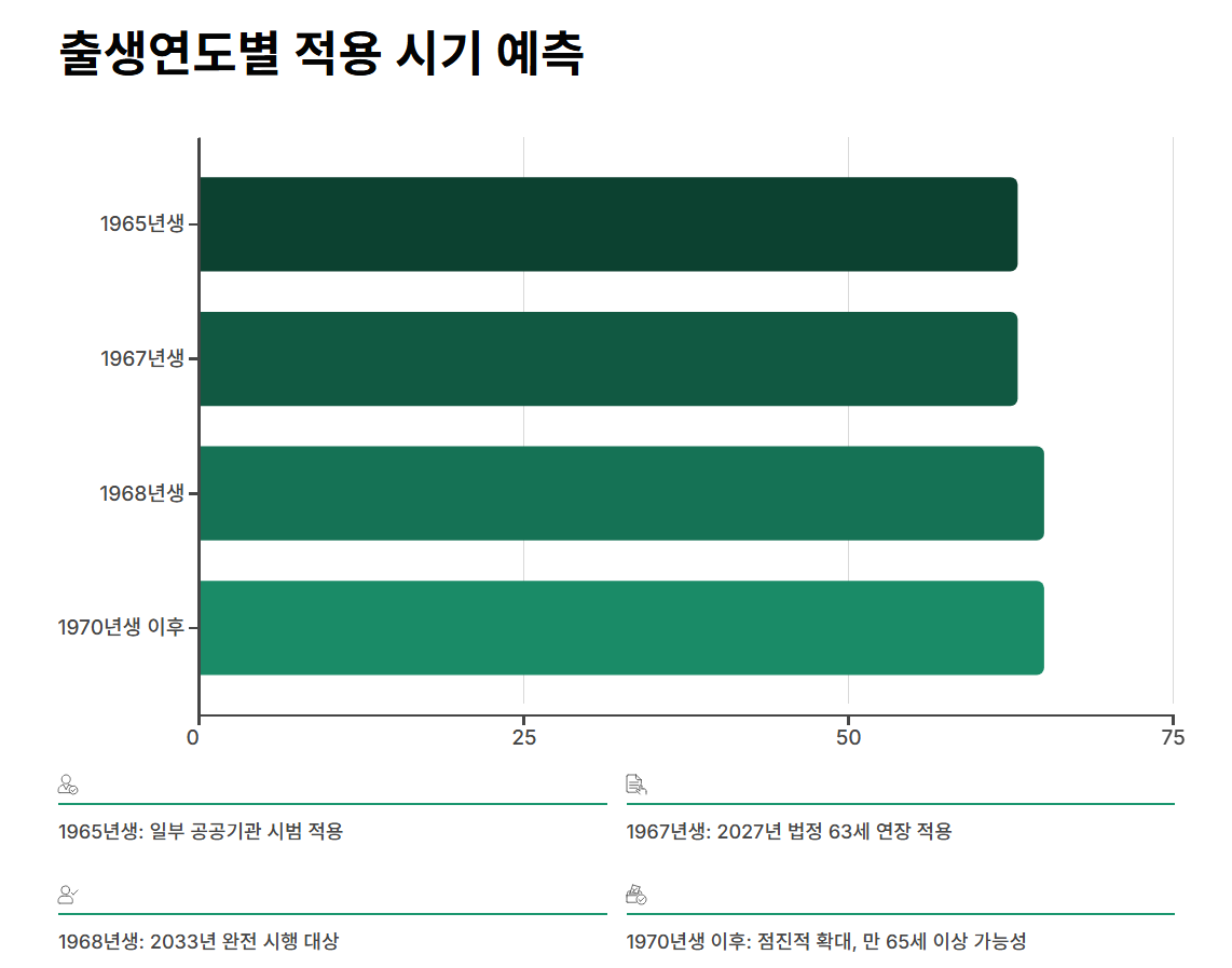 반면, 1968년생 이후 출생자들은 이후 단계에서 연차적으로 포함되며 2033년에는 만 65세 정년 혜택을 확실히 누릴 수 있습니다.