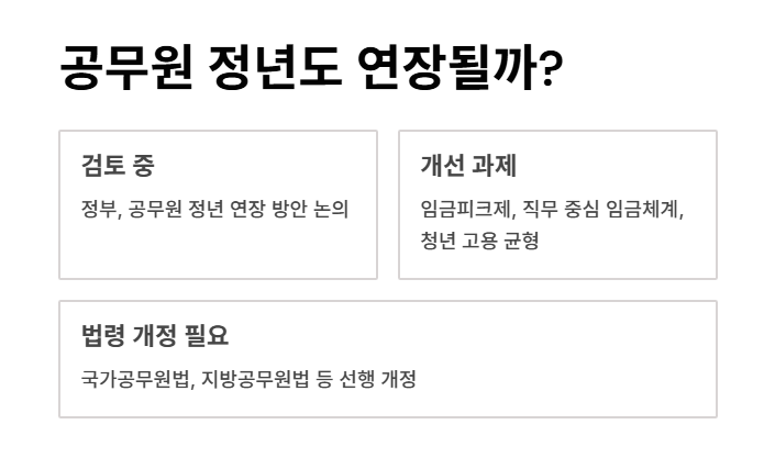 공무원 정년 연장은 국가공무원법, 지방공무원법 등 관련 법령 개정이 선행되어야 하며, 향후 사회적 논의와 함께 점진적으로 진행될 가능성이 큽니다.