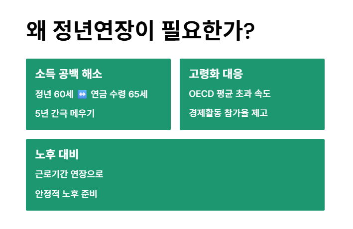 이런 맥락에서 정년연장은 단순히 근로기간을 늘리는 것이 아니라, 노후 대비를 위한 핵심적인 정책 변화라고 볼 수 있습니다.