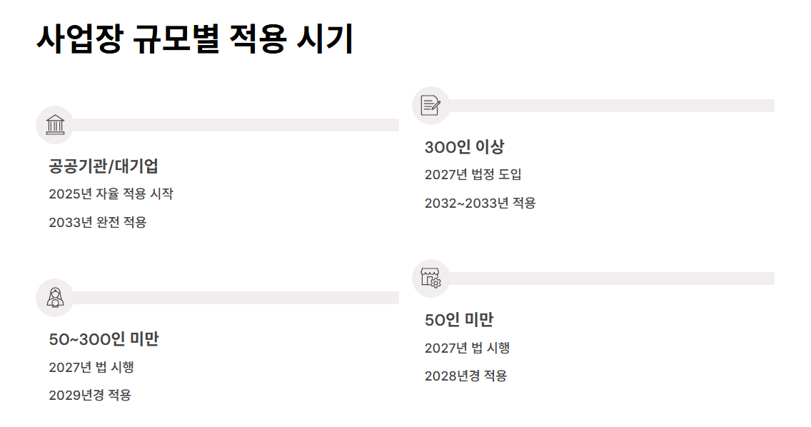 | 300인 이상 사업장 | 2027년 법정 도입 | 5~6년 | 2032~2033년 |