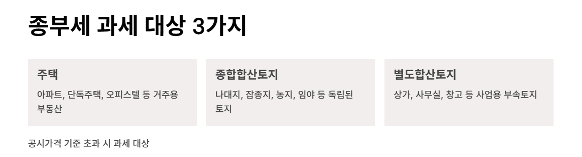 종부세는 크게 세 가지 과세 대상을 기준으로 나뉘어요.