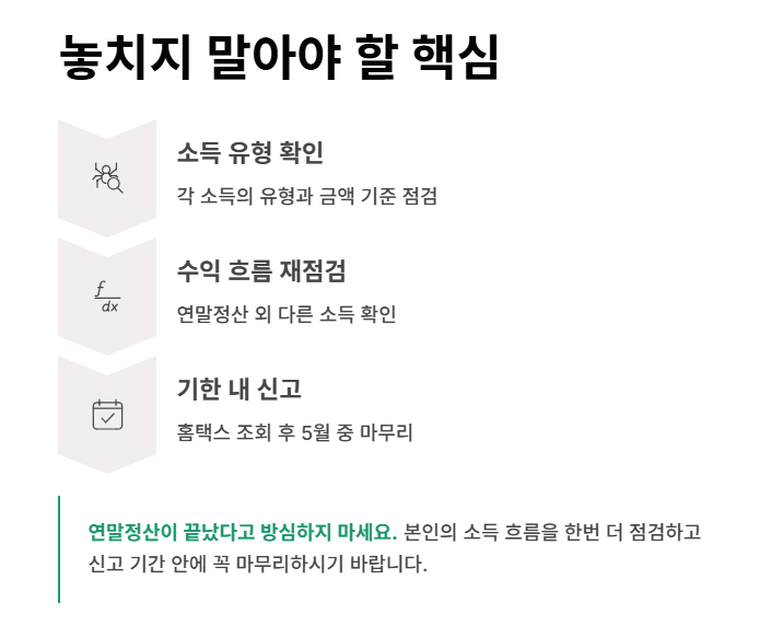 연말정산이 끝났다고 방심하기보다는, 본인의 다른 수익 흐름을 한번 더 점검해 보세요. 필요하다면 홈택스를 통해 대상 여부를 조회하고, 신고 기간 안에 꼭 마무리하시기 바랍니다.