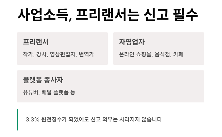 디자이너, 강사, 작가, 유튜버, 배달 플랫폼 종사자 등은 사업소득자에 해당되며, 연간 수입과 비용을 정리해 반드시 5월에 신고해야 합니다.