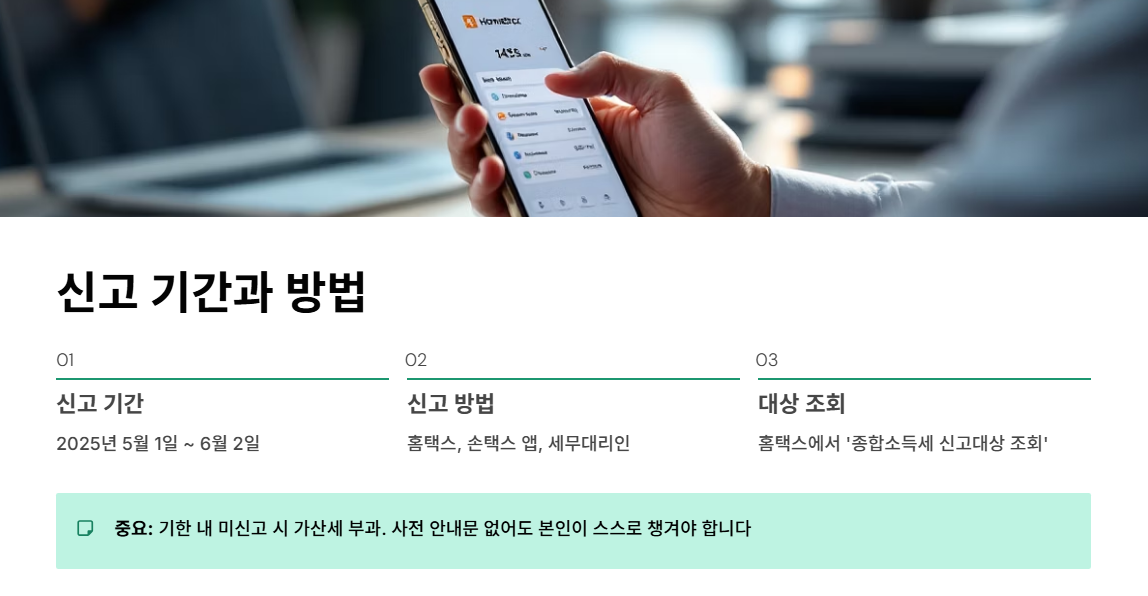 2025년 종합소득세 신고 기간은 5월 1일부터 6월 2일까지입니다. 홈택스, 손택스 앱 또는 세무대리인을 통해 신고할 수 있으며, 홈택스에서 ‘종합소득세 신고대상 조회’로 간단히 확인 가능합니다.