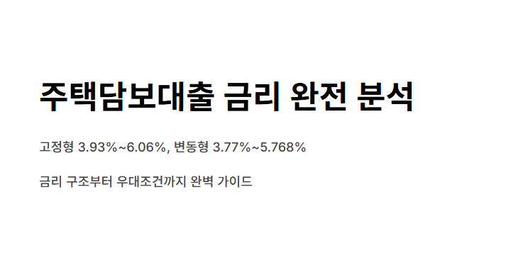 11월 현재 주택담보대출 금리는 고정형 기준으로 3.93%부터 시작해 일부 금융사에선 6%대 초반까지 형성되고 있습니다. 변동금리도 3.77%부터 5.768%까지 상당히 넓은 범위를 보이는데요. 이 글에서는 주요 금융사의 대출 금리를 비교하고, 금리 산정 구조와 우대금리까지 꼼꼼하게 정리해드립니다.
