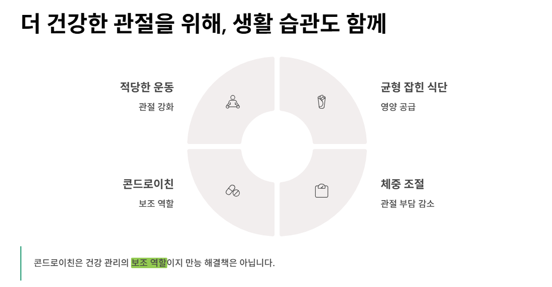 콘드로이친만 복용한다고 관절이 기적처럼 회복되는 건 아닙니다. 적당한 운동, 균형 잡힌 식단, 체중 조절 같은 기본적인 생활 습관도 병행해야 시너지 효과가 나타납니다.