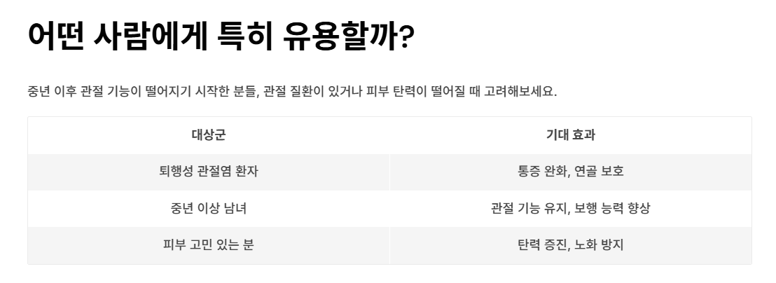 | 퇴행성 관절염 환자 | 통증 완화, 연골 보호 |