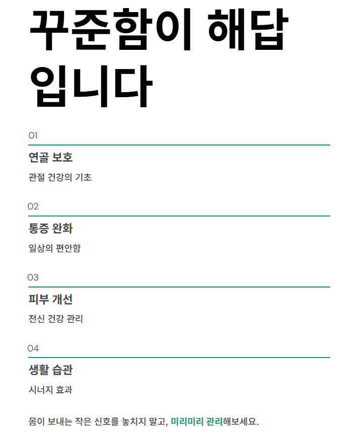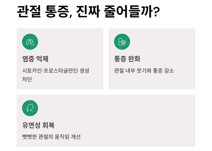 무릎이나 고관절처럼 하중이 실리는 관절 부위에서 특히 효과가 두드러졌다고 해요. 관절 유연성 회복이 중요하다면 충분히 고려해볼 만한 성분입니다.