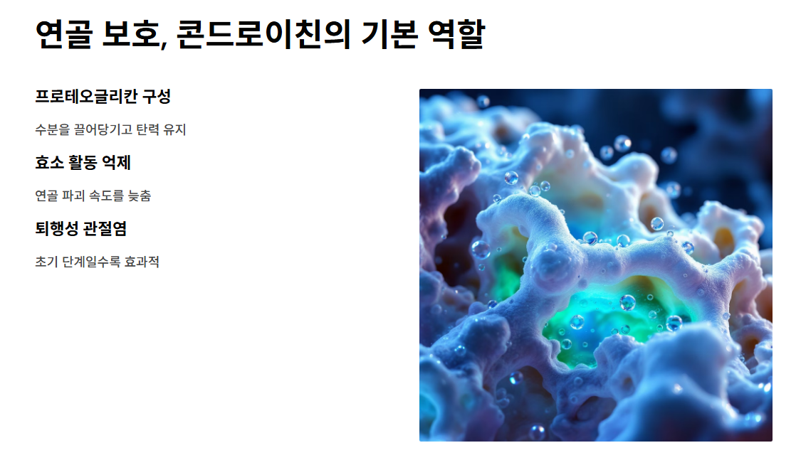 관절이 뻣뻣하거나 계단을 오를 때 무릎이 찌릿하다면, 지금 필요한 건 ‘콘드로이친’일 수 있습니다. 연골의 핵심 성분인 이 물질은 관절 통증 완화는 물론, 피부 건강과 전신 노화 방지까지 다양한 역할을 한다고 알려져 있는데요. 이 글에서는 콘드로이친이 우리 몸에서 어떤 기능을 수행하는지, 또 어떻게 섭취해야 좋은지 구체적으로 정리해드립니다.