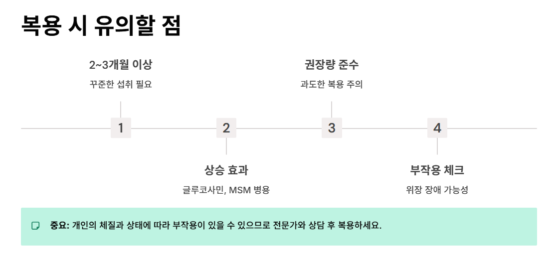 효과를 기대하려면 하루 이틀로는 어렵습니다. 보통 2~3개월 이상은 꾸준히 섭취해야 변화가 관찰됩니다. 특히 글루코사민이나 MSM과 함께 섭취하면 상승 효과를 볼 수 있으나, 개인의 체질과 상태에 따라 부작용이 있을 수 있어 주의가 필요합니다.