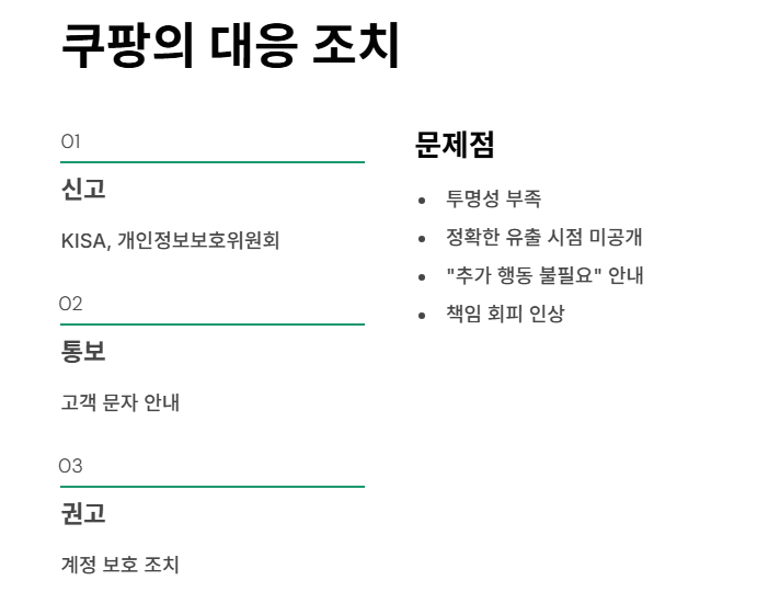 쿠팡은 한국인터넷진흥원(KISA), 개인정보보호위원회 등에 신고하고, 고객에게는 문자로 통보하며 계정 보호 조치를 권고했습니다.