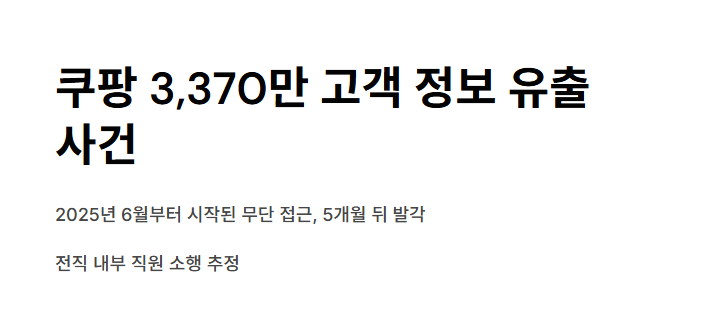 약 3,370만 개에 달하는 쿠팡 고객 계정의 개인정보가 무단으로 유출되는 초대형 사건이 발생했습니다. 2025년 6월부터 해외 서버를 통한 접근이 있었음에도, 쿠팡은 무려 5개월 뒤인 11월에야 이를 인지하고 발표했습니다. 더 큰 문제는 이 유출이 외부 해커가 아닌 전직 내부 직원의 소행일 가능성이 높다는 점입니다. 고객 정보 보호에 대한 경각심이 그 어느 때보다 절실해졌습니다.