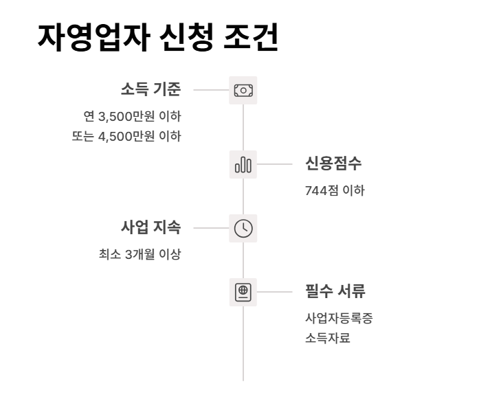 자영업자는 연소득 3,500만원 이하이거나, 4,500만원 이하이면서 신용평점이 744점 이하인 경우 신청할 수 있습니다.