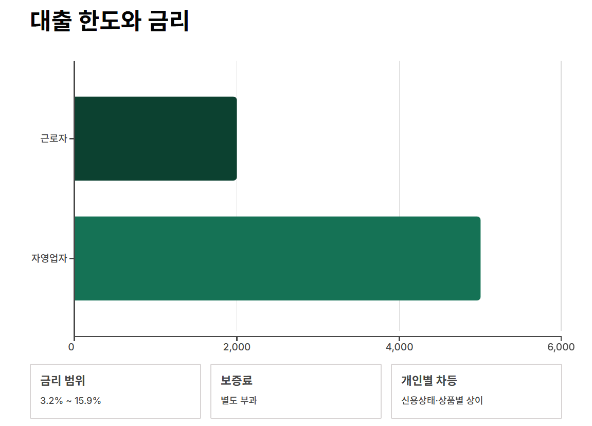| 자영업자 | 최대 2,000~5,000만원 | 약 3.2~15.9% |