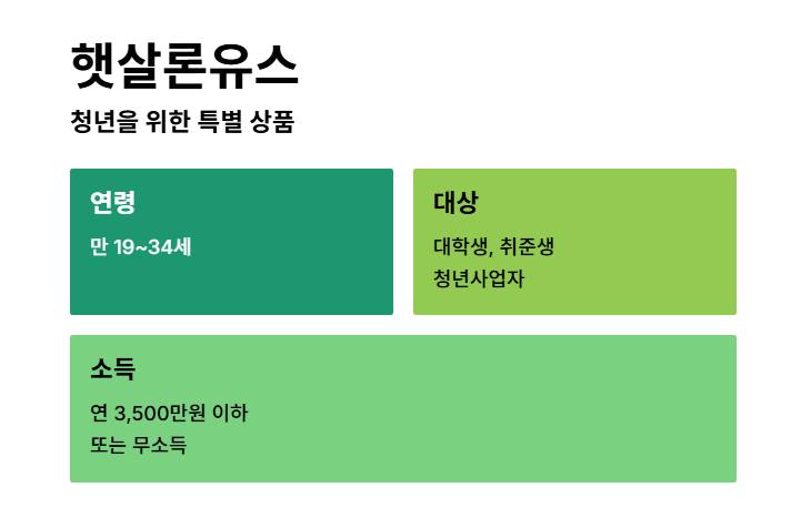 청년층을 위한 별도 상품인 '햇살론 유스'는 만 19세~34세 청년이라면 누구나 신청 가능하며,
