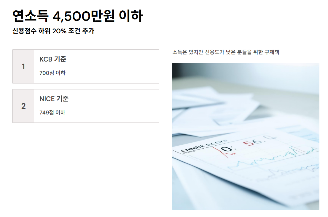 이 기준은 신청자에게 가장 유리한 조건 중 하나로, 신용점수가 낮더라도 소득 기준만 충족되면 지원 대상이 됩니다.